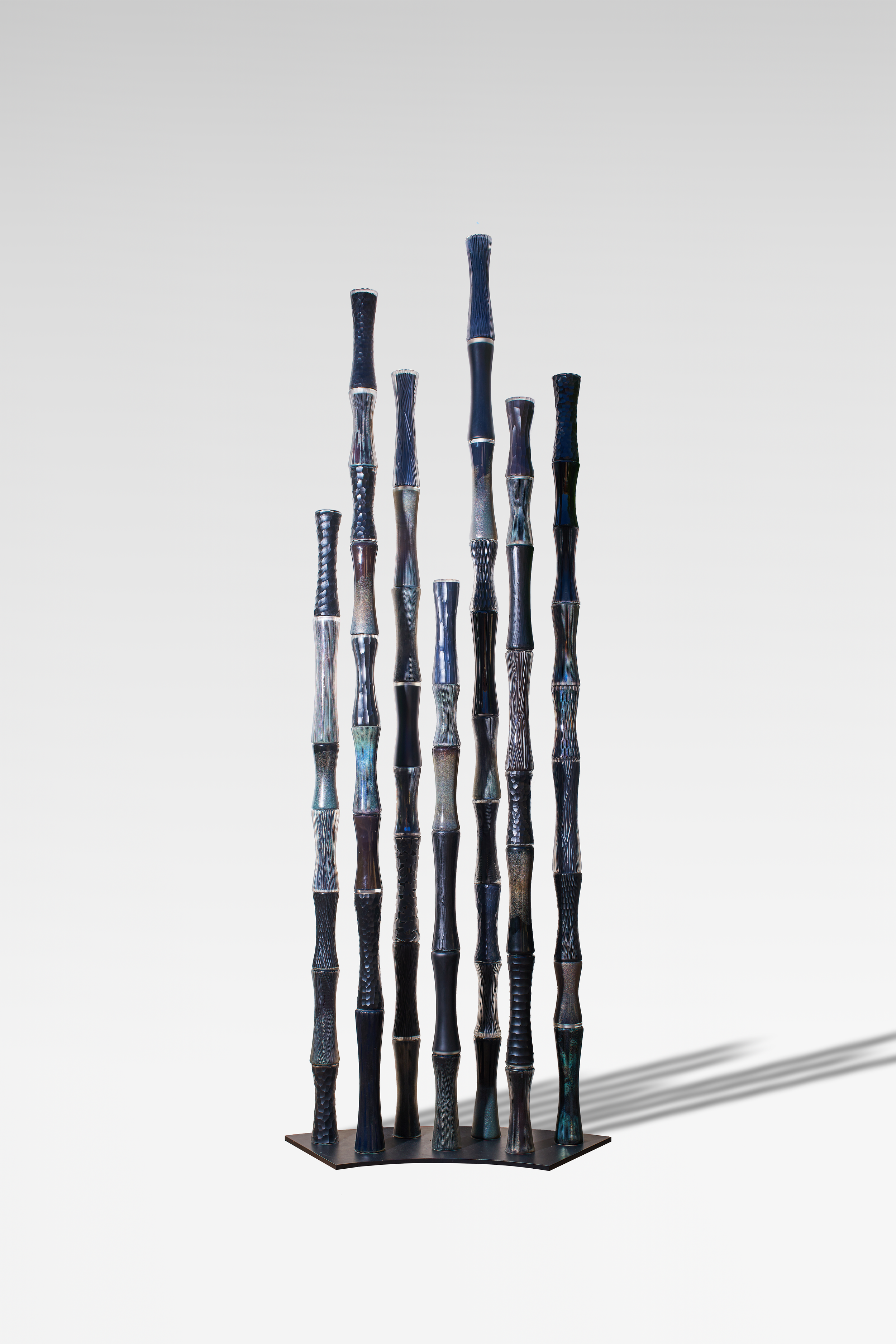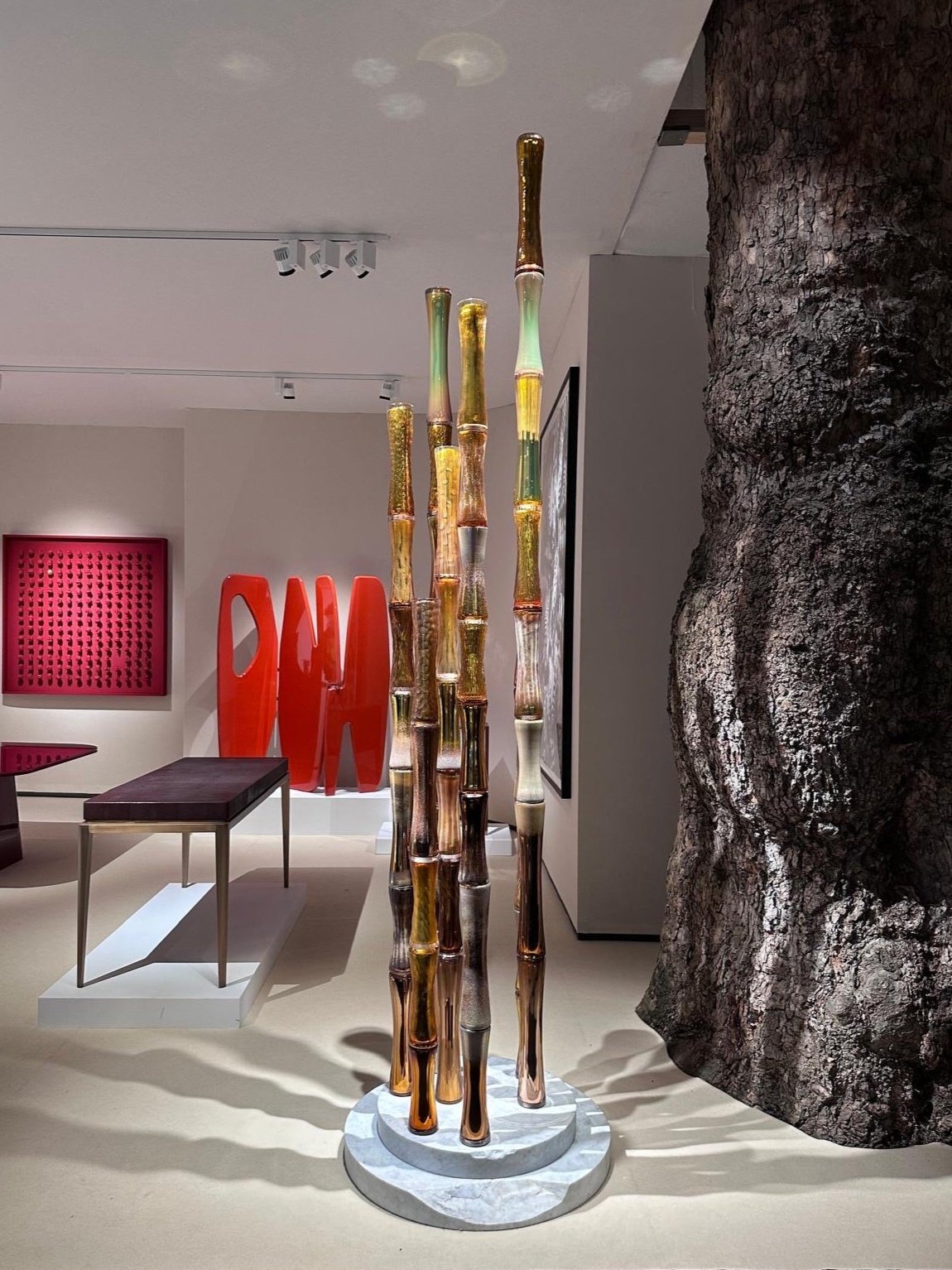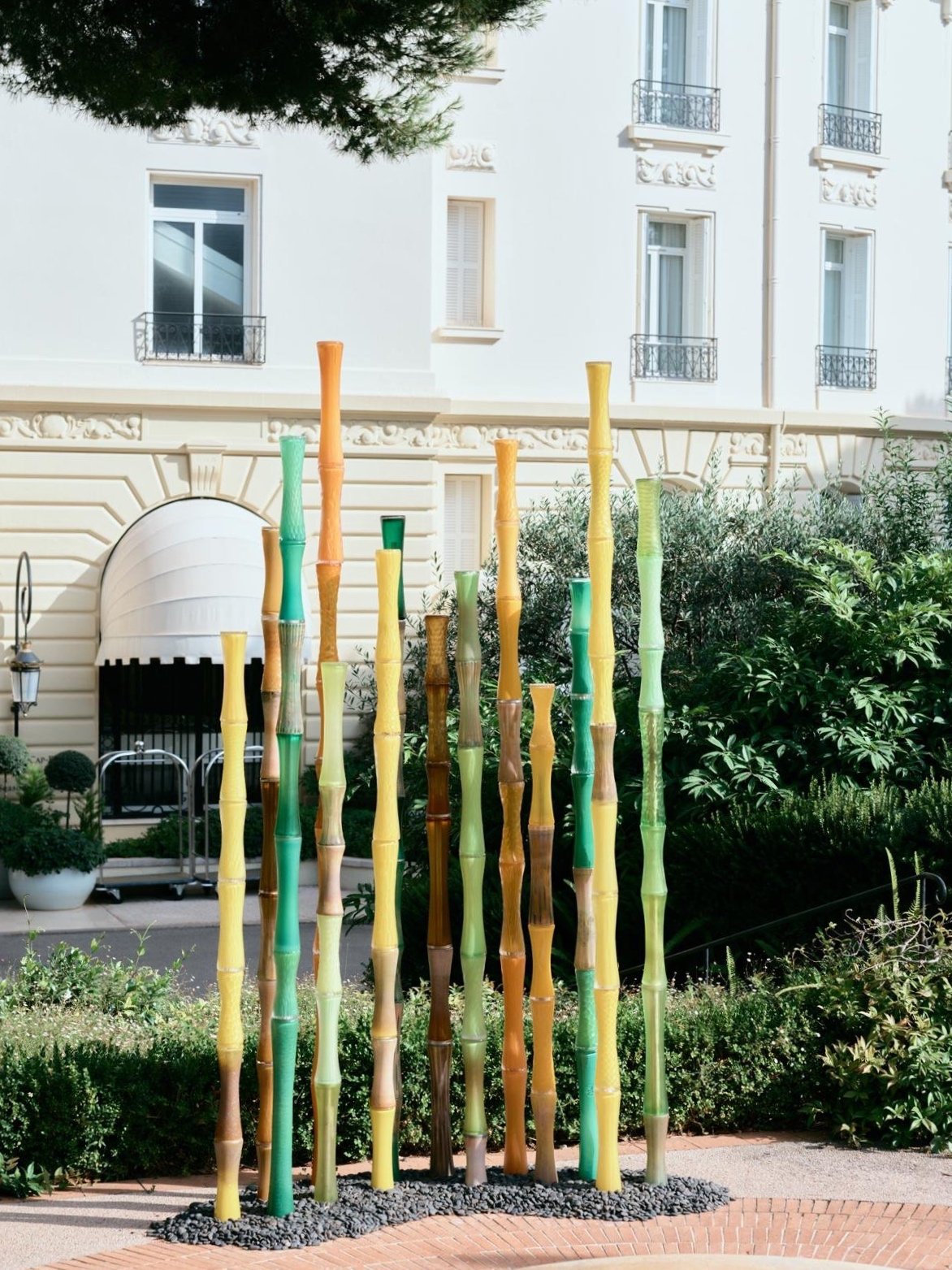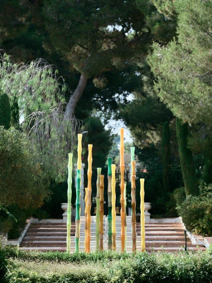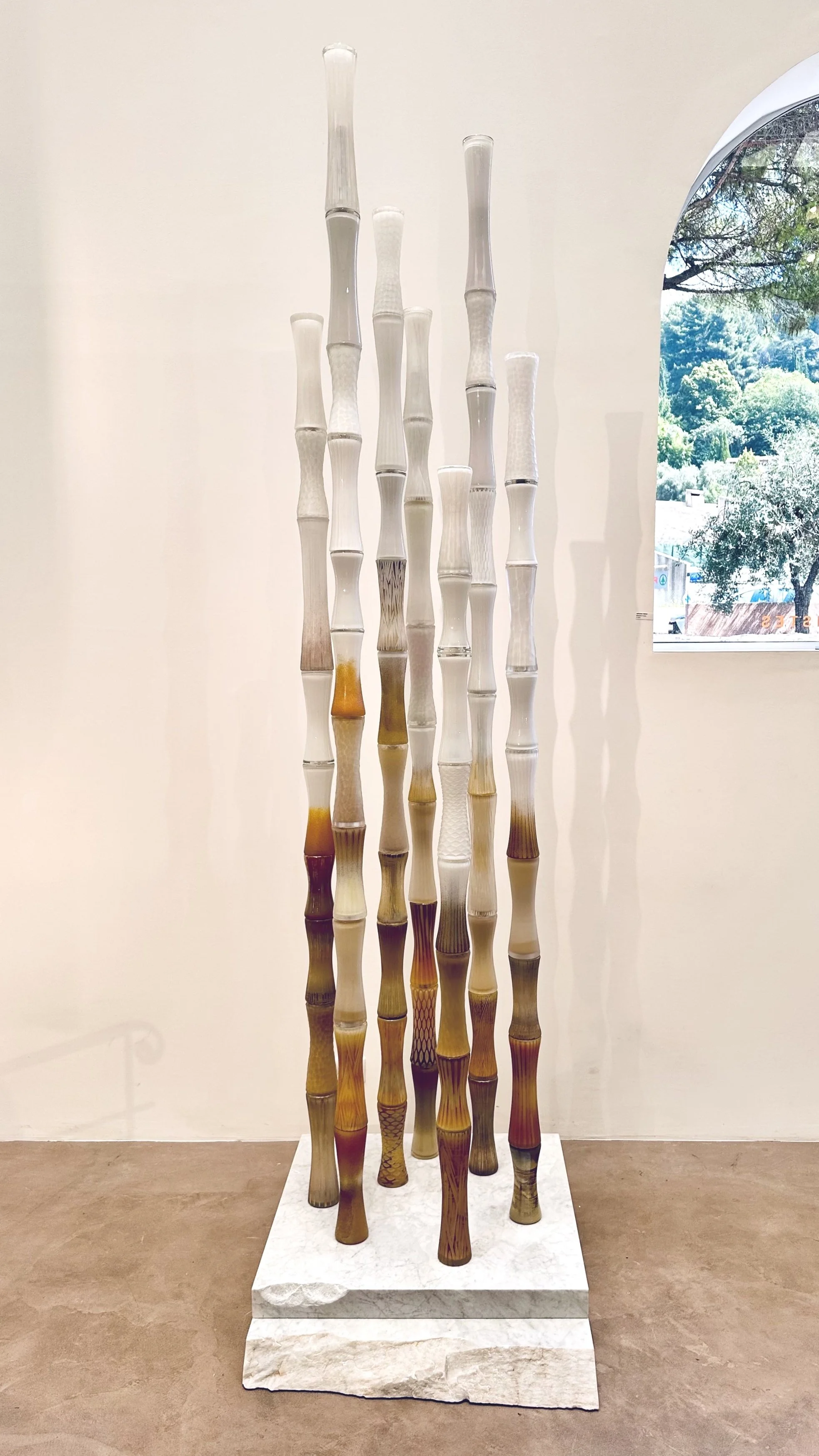 Pierini sculpts nature into symbolic forms. His Colonnes Roseaux are a tribute in glass to Constantin Brancusi’s “Endless Column”. They are a link between interior and exterior, between people and their surroundings, a correspondence conveyed by Le Corbusier. They stretch for the sky in alternating lengths and colors that embody a delicate deference.