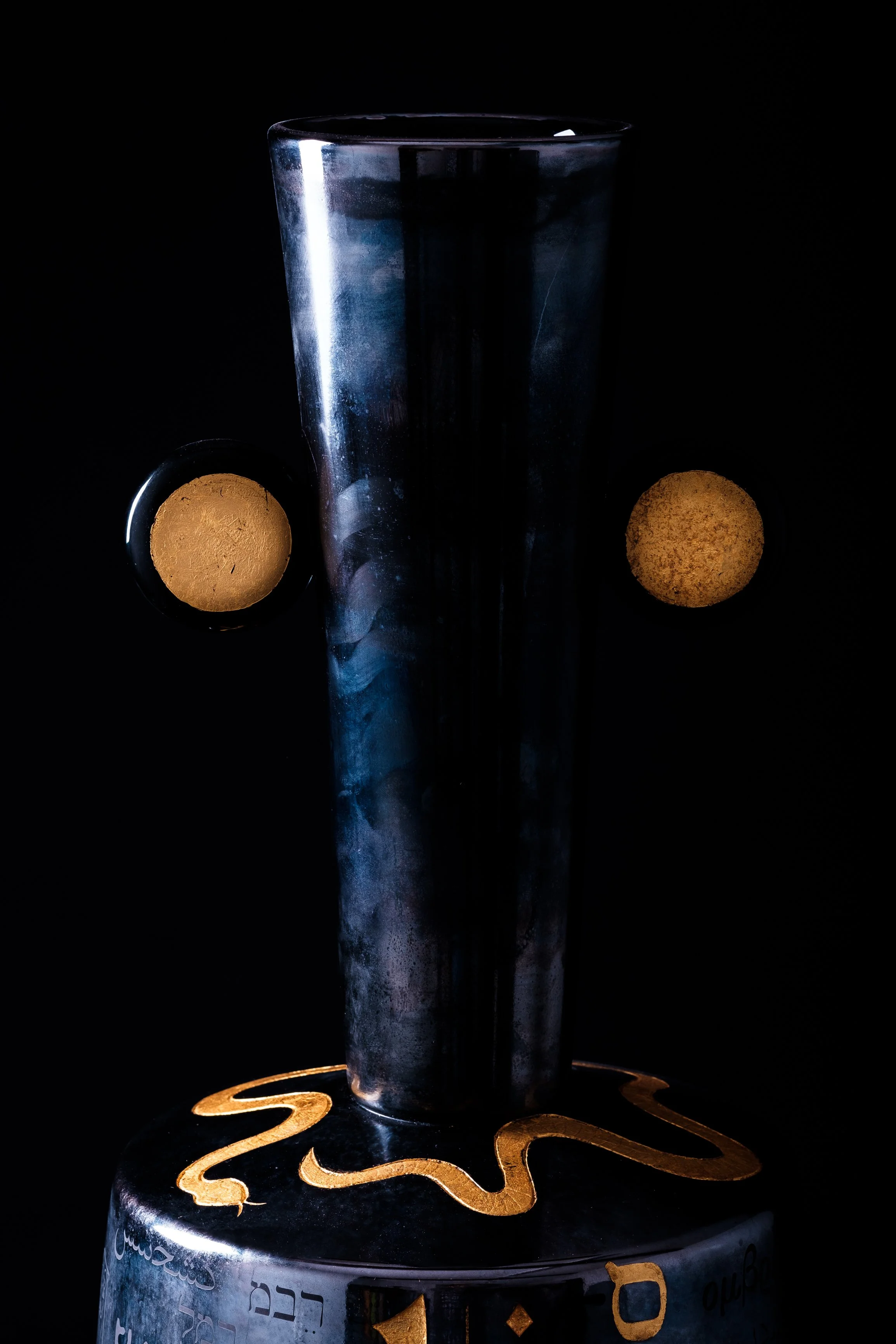 Part of a large collection of anthropomorphic amphoras created by Antoine Pierini, featuring distinctive colours and materials. The handles are reminiscent of ears à la Max Ernst. This sculpture is a nod to the antique amphoras found in the library and the Triklinos.
